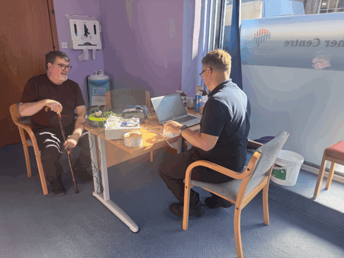 Stefan (right) calibrating a BP Monitor at The Jenner Centre
