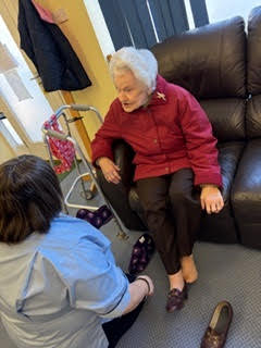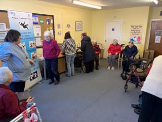 This session was supported by the Angus Falls Service with Joyce Simpson, the Falls Assessor spending time with those trying on the slippers and giving advice. Joyce says “ The Angus Falls Service is for anyone who has a history of falls, has a fear of falling, feeling unstable or has a low bone density and or a family history of osteoporosis”.